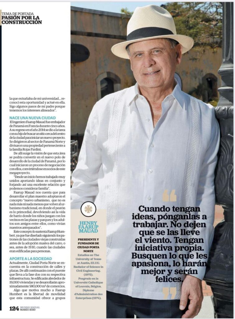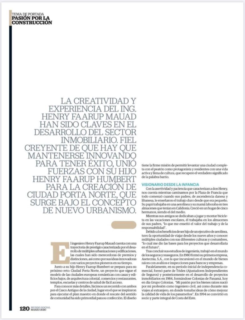 La creatividad y experiencia del Ing. Henry Faarup Mauad han sido claves en el desarrollo del sector inmobiliario. Fiel creyente de que hay que mantenerse innovando para tener éxito, unió fuerzas con su hijo, Henry Faarup Humbert, para la creación de Ciudad Porta Norte, que surge bajo el concepto del Nuevo Urbanismo.