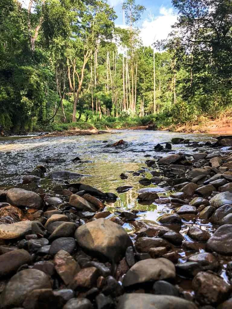 A muchos les encanta bajar a hacer un asado y un pique nique. Qué rico tener esa dosis de naturaleza tropical un martes cualquiera a tan solo unos pasos. Es alimento para el espíritu. Al terminar de hacer ejercicio me acerco al borde del río donde hay unos niños bañándose jugando con ranitas. Observo cómo el agua pasa entre las rocas, me arrodillo, meto mis manos en el agua fría y me remojo la cara.